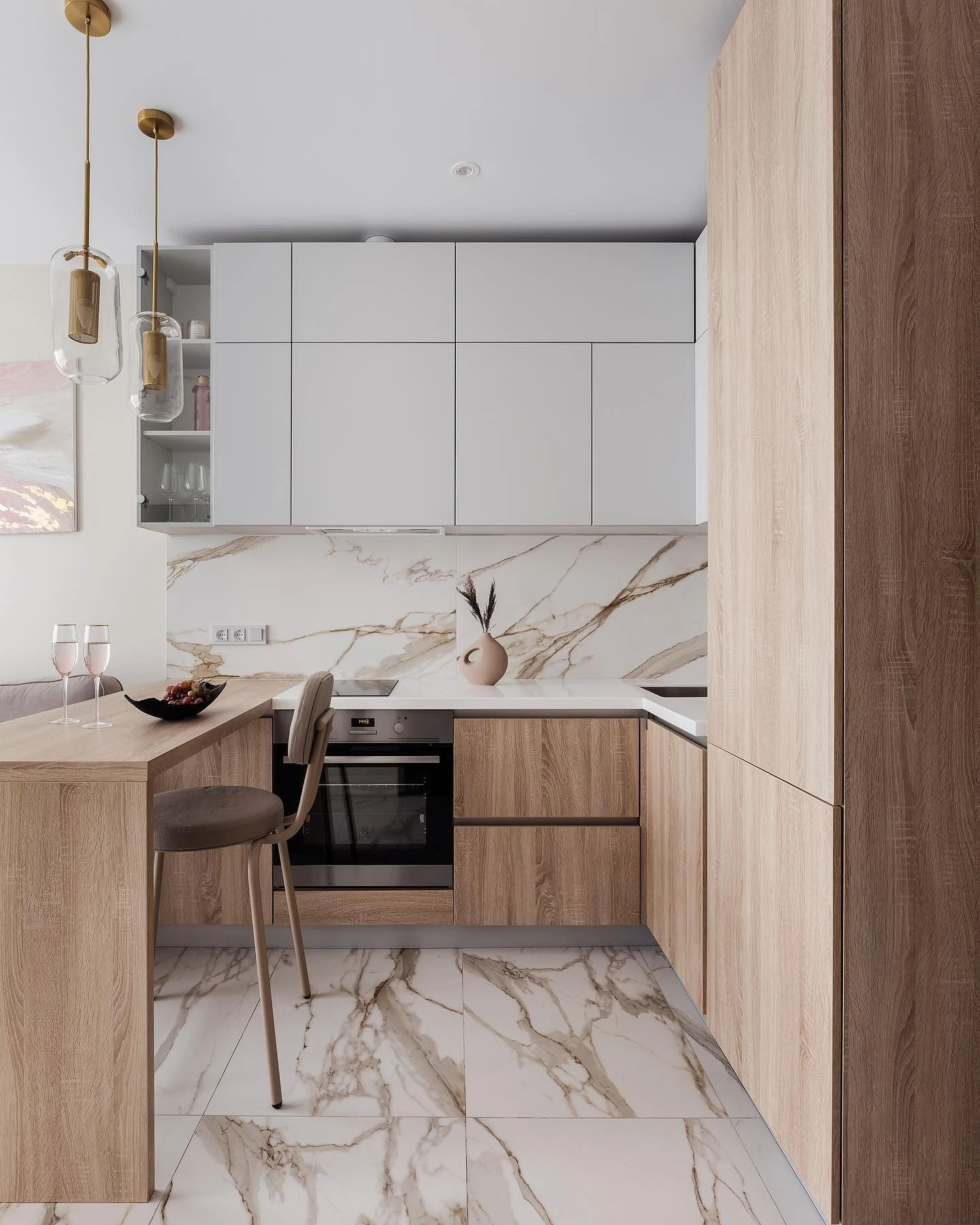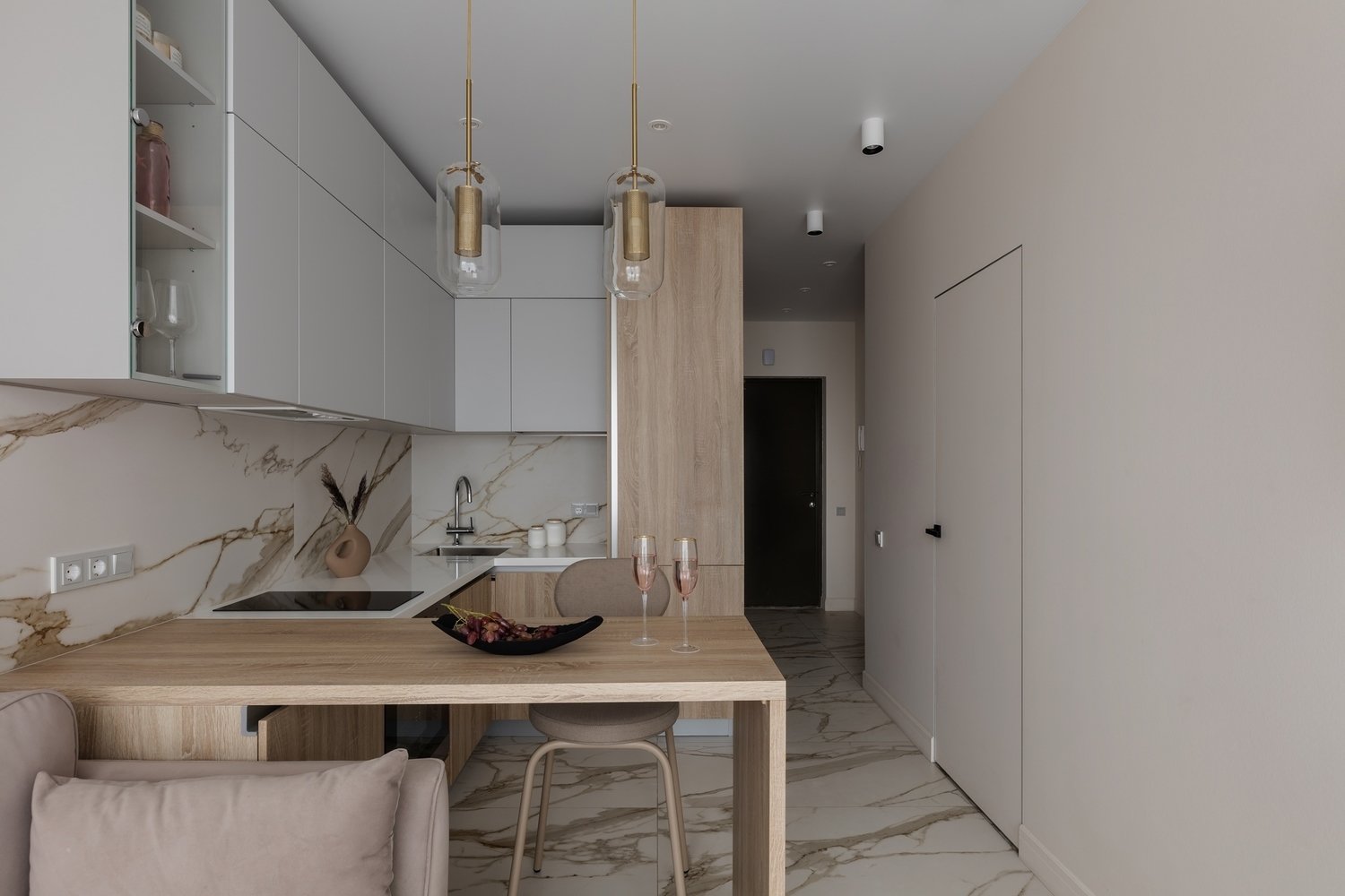П-образная планировка универсальна и подходит почти для всех типов кухонь, особенно, если у вас совмещенная кухня-гостиная или студия. Полуостровная кухня делает переход между кухней и гостиной плавным: полуостров отлично зонирует открытое пространство и маскирует «рабочую» часть кухни. В такой кухне много места для хранения и максимум рабочих поверхностей. Гарнитур выполнен в белом и бежевом тонах, благодаря этому, мебель визуально не загромождает пространство.