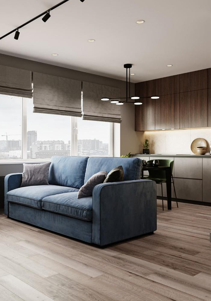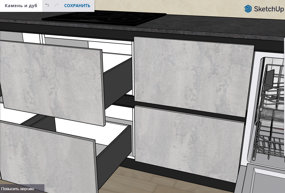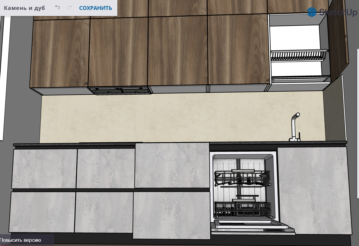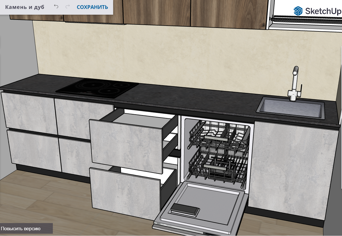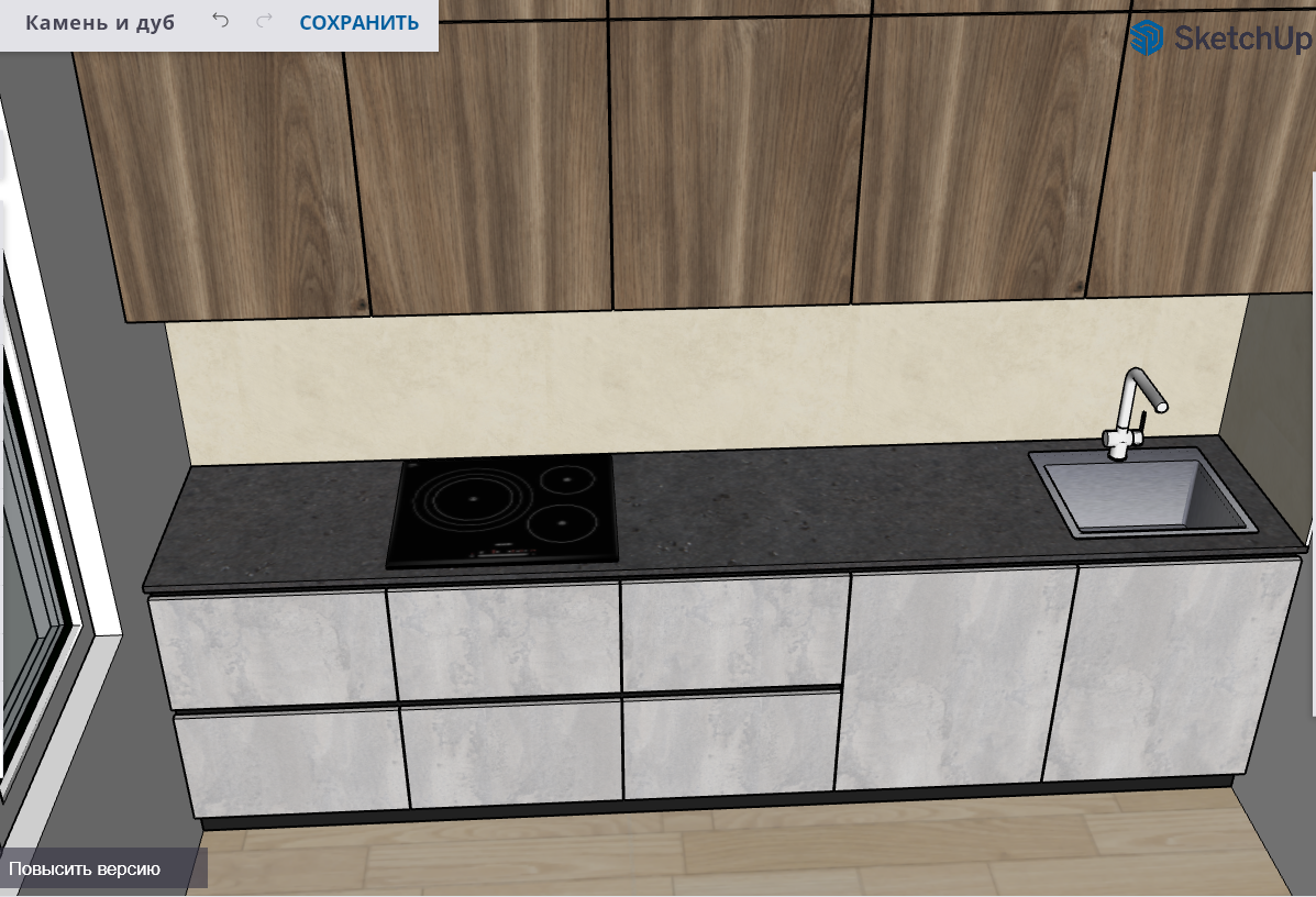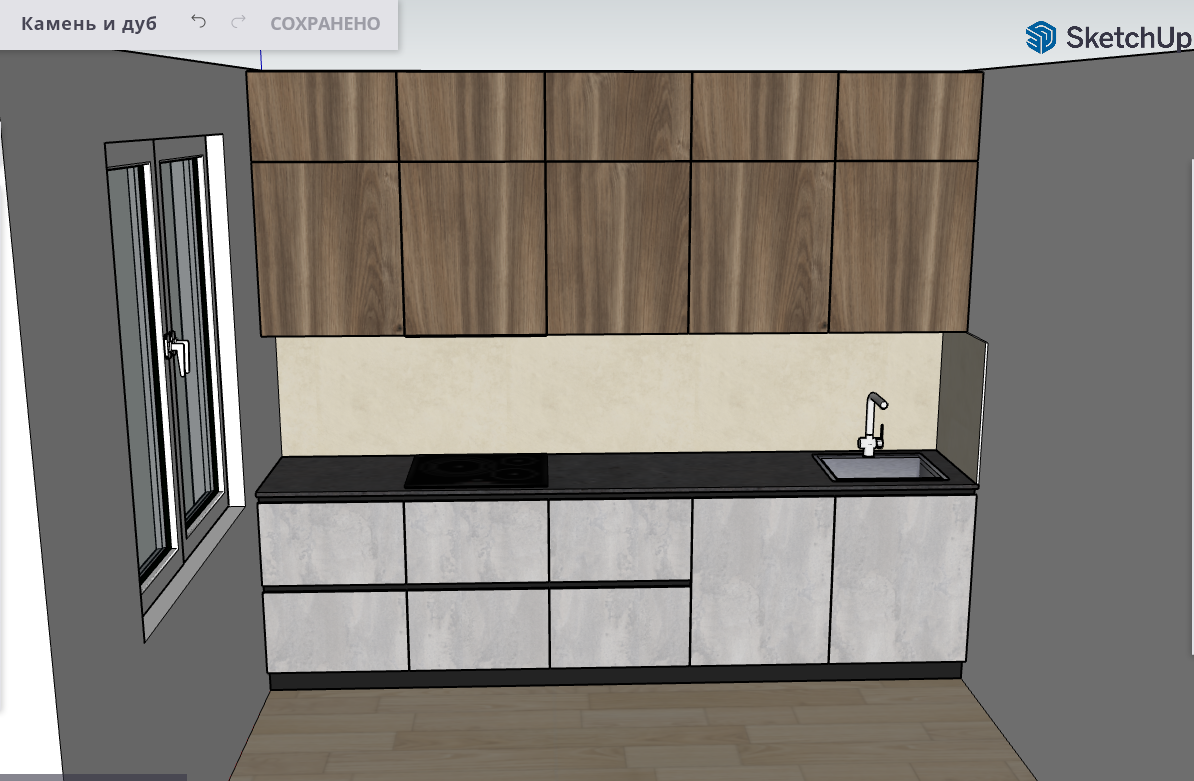 В самых модных проектах камень сочетают с деревом. Так и здесь образ «каменного» низа гарнитура дополняет верх оттенка «дуб». Мебель с фактурой камня в сочетании с натуральными тонами будет актуальна всегда и никогда не надоест своим владельцам. Ровные, четкие линии и простая геометрия позволяют добиться стильного и современного интерьера.