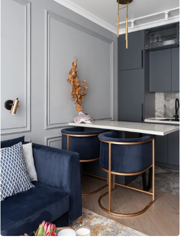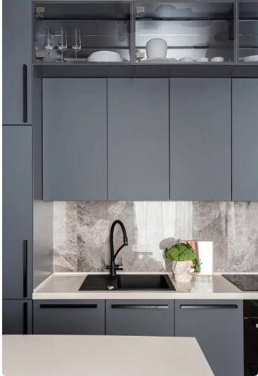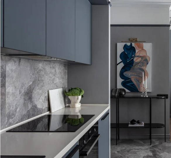 Серый цвет в интерьере давно перестал быть скучным и мрачным, теперь он олицетворяет хороший вкус и чувство стиля. Соотношение серых фасадов кухни с белой столешницей- узнаваемые приметы скандинавского стиля. Белая поверхность гарантированно смягчает холодный тон фасадов и блеск метала бытовой техники. Последний тренд — антресоли с витринами . Строгий дизайн кухни и минимализм фасадов компенсирует умная фурнитура, скрытые системы хранения и продуманная организация шкафов. Гарнитур утоплен в стены, что позволяет добиться визуального увеличения пространства. Вся бытовая техника спрятана в мебельные тумбы. Все лаконично и строго, здесь нет ничего лишнего, только необходимые предметы мебели, максимум удобства и функциональности.